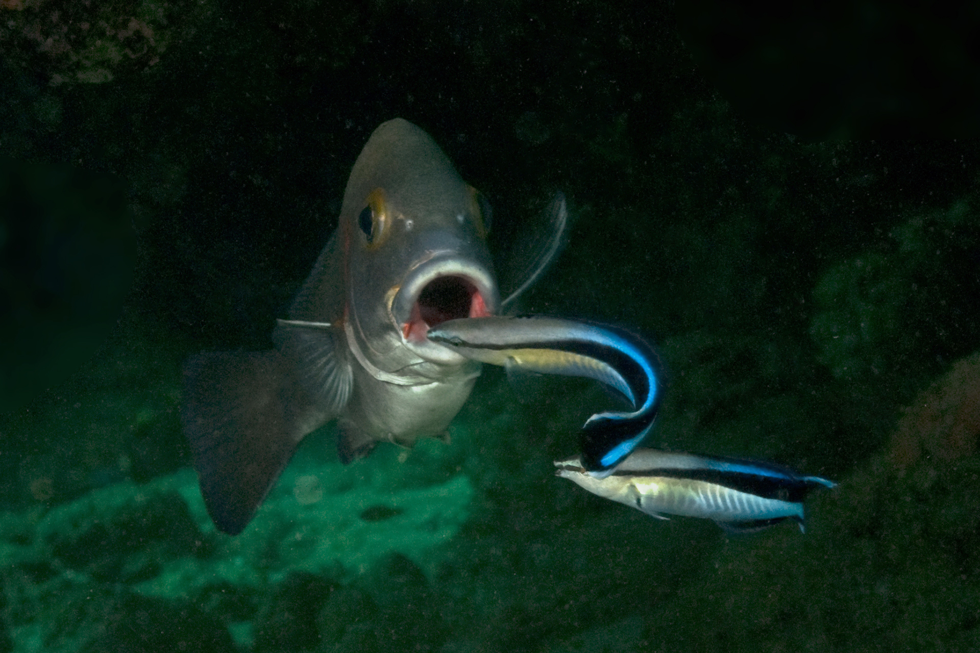 Vooral op de koraalriffen in warme wateren vind je overal poetsstations, waar speciale poetsvisjes hun diensten aanbieden. Vaak staan de vissen in de rij te wachten. Het is een interessant schouwspel om waar te nemen, maar foto’s maken is niet makkelijk. De slimme vissen houden altijd een afstand, die net buiten het flitsbereik valt (1 meter). Ik heb al van alles geprobeerd, de agressieve uitval, dan schieten ze weg. De geduldige houding, van: ik laat ze lekker aan mij wennen!?! Dat werkt ook niet, want de vissen hebben de hele dag de tijd… Pas in Oman lukte het om wat aardige poetsopnames te maken.