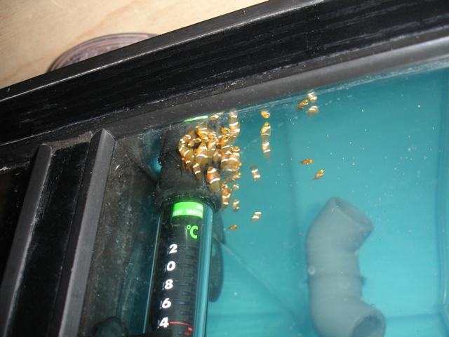 Nadat alle larven in de kweekbak zitten kan deze worden gesloten. Nu kan de stroming in de hoofd bak weer inwerking worden gesteld en is het nerveuze afwachten begonnen.