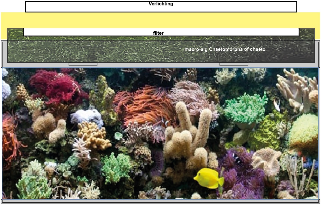 In mijn 200 cm bakken gebruik ik de algen/wierengoot in de lichtkap (zie mijn artikel Algen/wierenfilter op www.zeeaquarium.me) in combinatie met een pvc-buis/vat, filterpot of binnenfilter, gevuld met twee liter Siporax en een laag van twintig tot dertig cm koraalzand. Deze combinatie en hoeveelheid moet wel aangepast worden aan de hoeveelheid dieren. Gebruik wel een laag filterwatten om de Siporax te beschermen tegen teveel vuil. Dichtslibben van de pijpjes moet voorkomen worden. Dit systeem gebruik ik dus al ruim dertig jaar tot volle tevredenheid.