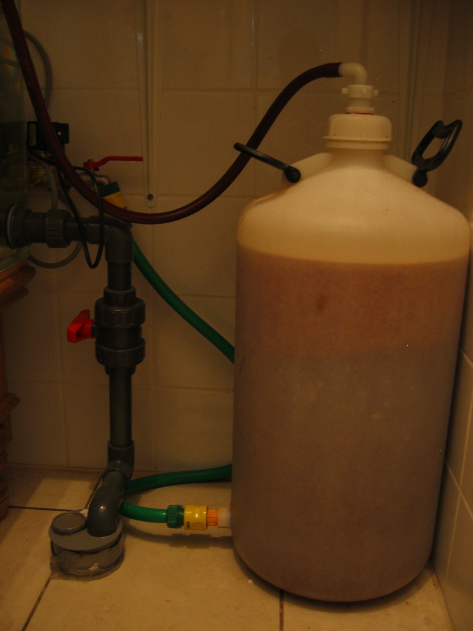 Het verdampt water wordt automatisch bijgevuld. De niveausensor bewaakt constant het waterniveau. Wordt het waterniveau door verdamping te laag dan zal de IKS een schakelcontactdoos bekrachtigen. Hierop is een magneetventiel aangesloten dat zal openen en zo zal via mijn mengbed ionenwisselaar water bijgevuld worden.