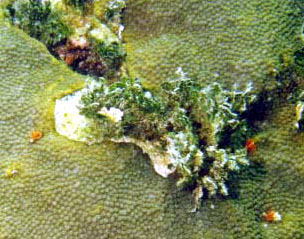 Foto 29. Alhoewel ze er uit zien als visbeten, zijn deze plekken ver-oorzaakt door koraalminnende slakken, Coralliophila abbreviata. Foto Eric Borneman.