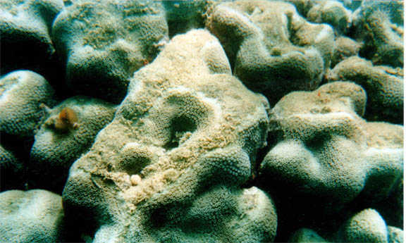 Scheuren of doorboren is echter niet de enige manier waarbij verwon-ding tot witte plekken op een koraal skelet kan leiden. Koralen zijn erg gevoelig voor schuren door zand, voor plaatselijke bleking of weefsel verlies door sedimentatie.