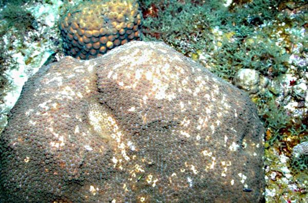 Ik vermeldde ook al dat koraal bleking erg moeilijk te onderscheiden kan zijn van weefsel verlies. Gebleekte koralen hebben transparant weefsel zodat het skelet eronder zichtbaar is, of in sommige gevallen is het weefsel moeilijk te zien omdat het grotendeels teruggetrokken is. Ook hier kunnen verschillende oorzaken tot bleking, weefsel verlies, of beiden leiden.